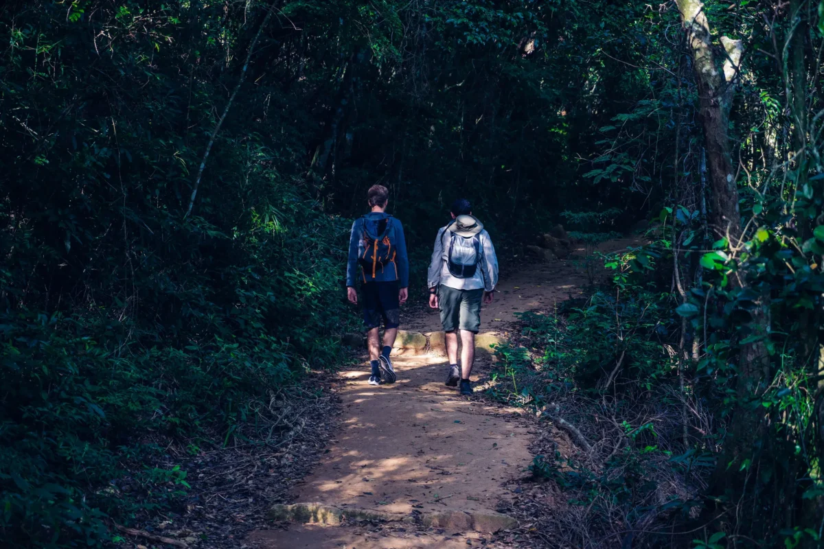 Comfortable hiking shoes, light clothes, a raincoat, sunscreen, a sunhat, sunglasses, snacks, 1 liter of water, bug repellent, and a plastic bag for trash